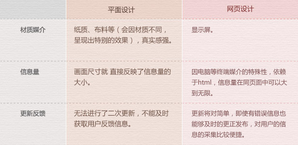 平麵設計屬於比較傳統的信息媒介設計,一般會通過張貼、銷售、郵(you)寄(ji)派(pai)送(song)等(deng)形(xing)式(shi)進(jin)行(xing)傳(chuan)播(bo),這(zhe)樣(yang)傳(chuan)播(bo)的(de)方(fang)式(shi)範(fan)圍(wei)小(xiao)且(qie)成(cheng)本(ben)較(jiao)高(gao),相(xiang)對(dui)而(er)言(yan)在(zai)這(zhe)方(fang)麵(mian)網(wang)頁(ye)設(she)計(ji)的(de)信(xin)息(xi)傳(chuan)播(bo)能(neng)力(li)卻(que)非(fei)常(chang)的(de)強(qiang),但(dan)依(yi)賴(lai)於(yu)第(di)三(san)方(fang)媒(mei)介(jie)的(de)支(zhi)持(chi),平(ping)麵(mian)設(she)計(ji)卻(que)擁(yong)有(you)更(geng)為(wei)廣(guang)泛(fan)的(de)受(shou)眾(zhong)人(ren)群(qun),不(bu)同(tong)的(de)年(nian)齡(ling)層(ceng)對(dui)於(yu)紙(zhi)張(zhang)或(huo)書(shu)本(ben)的(de)信(xin)息(xi)接(jie)受(shou)能(neng)力(li)總(zong)是(shi)強(qiang)於(yu)網(wang)絡(luo)媒(mei)體(ti)的(de),畢(bi)竟(jing)網(wang)絡(luo)信(xin)息(xi)獲(huo)取(qu)的(de)將(jiang)會(hui)存(cun)在(zai)一(yi)個(ge)學(xue)習(xi)成(cheng)本(ben),在(zai)今(jin)後(hou)網(wang)絡(luo)信(xin)息(xi)的(de)不(bu)斷(duan)普(pu)及(ji)以(yi)及(ji)終(zhong)端(duan)媒(mei)介(jie)用(yong)戶(hu)體(ti)驗(yan)的(de)不(bu)斷(duan)提(ti)升(sheng),在(zai)受(shou)眾(zhong)人(ren)群(qun)方(fang)麵(mian)在(zai)我(wo)看(kan)來(lai)差(cha)距(ju)會(hui)越(yue)來(lai)越(yue)小(xiao)。