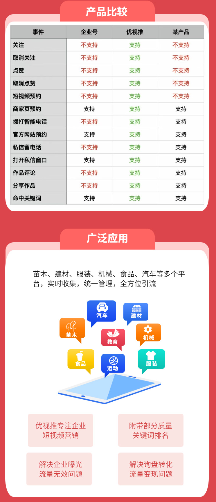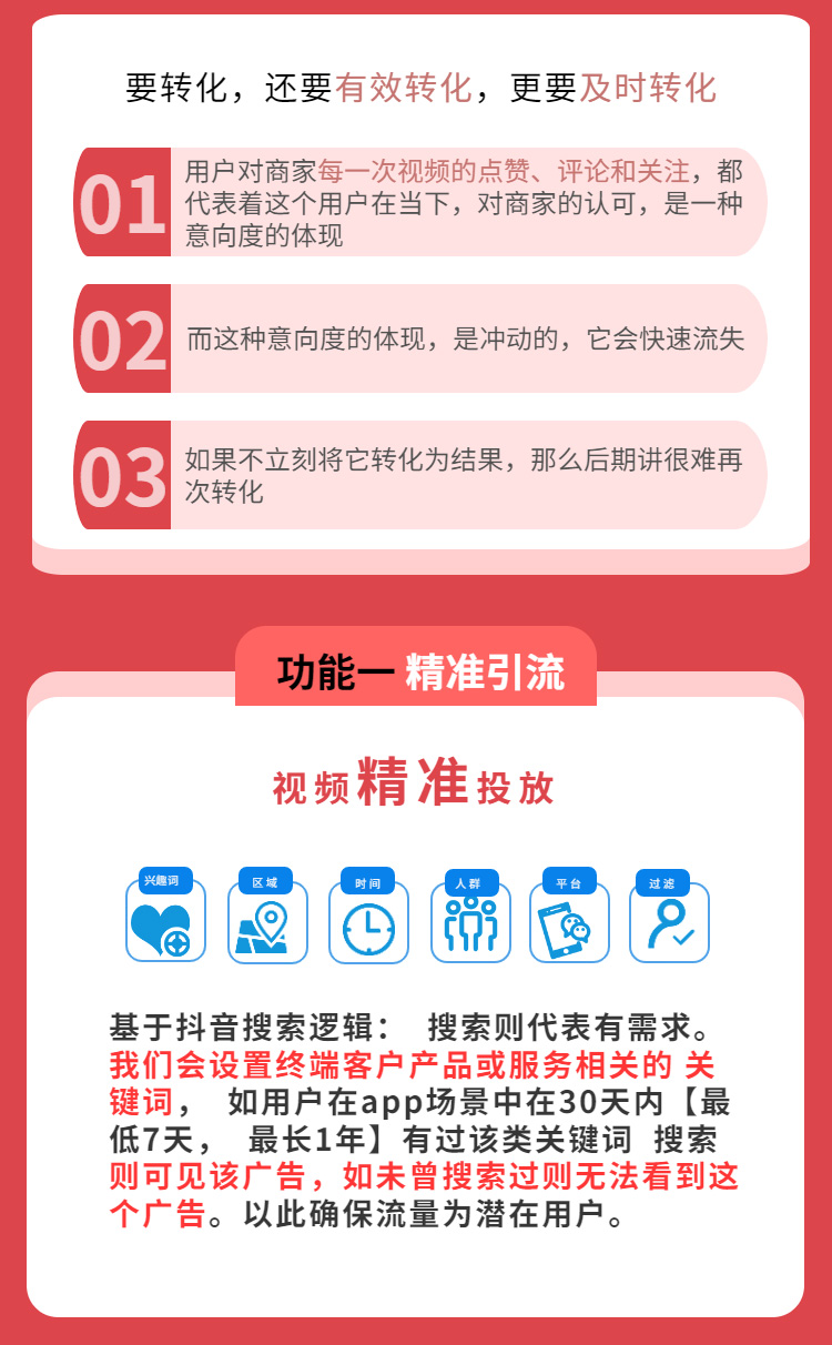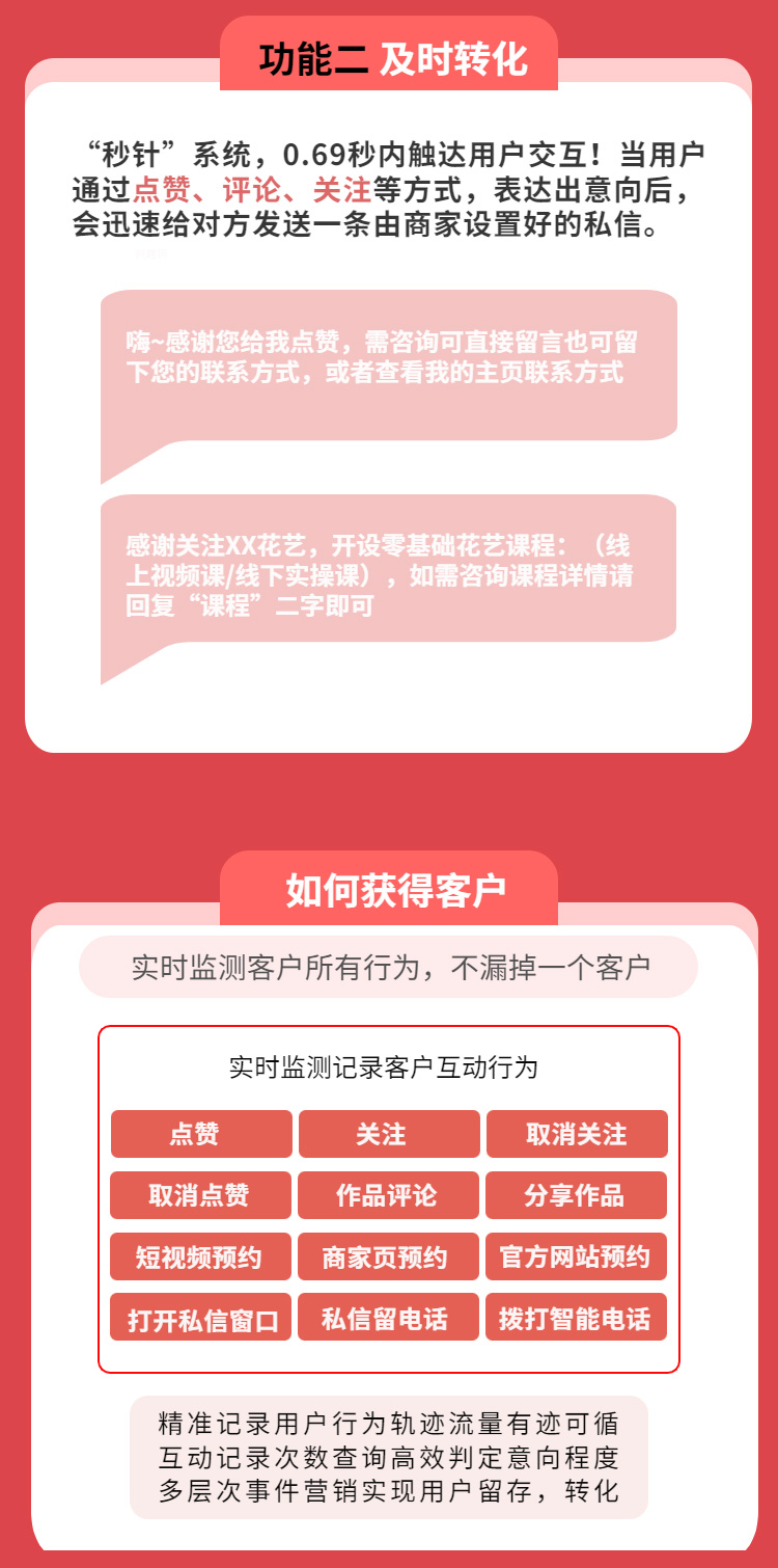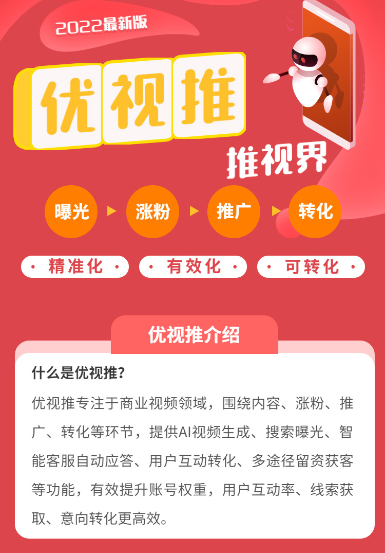 短視頻平台智能營銷獲客係統專注於商業視頻領域,國繞內容、漲粉、推廣、轉化等環節,提供Al視頻生成、搜索曝光、智能客服自動應答、用戶互動轉化、多途徑留資獲客等功能,有效提升賬號權重,用戶互動率、線索獲取、意向轉化更高效。